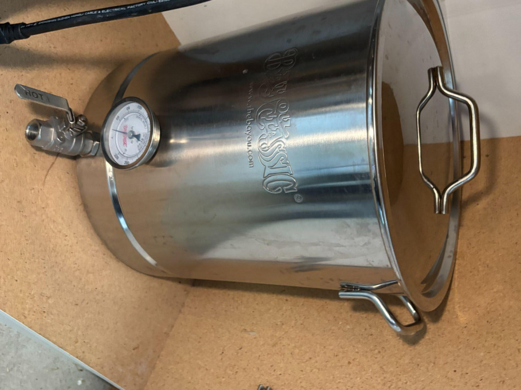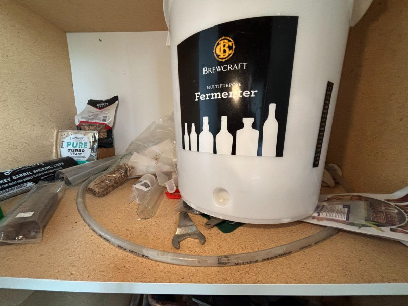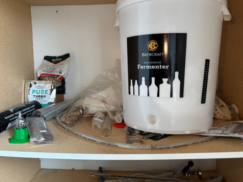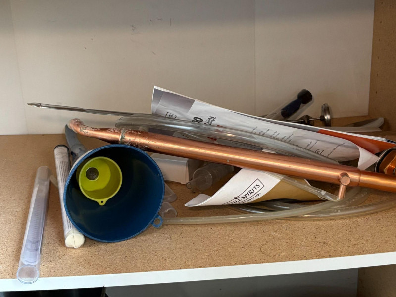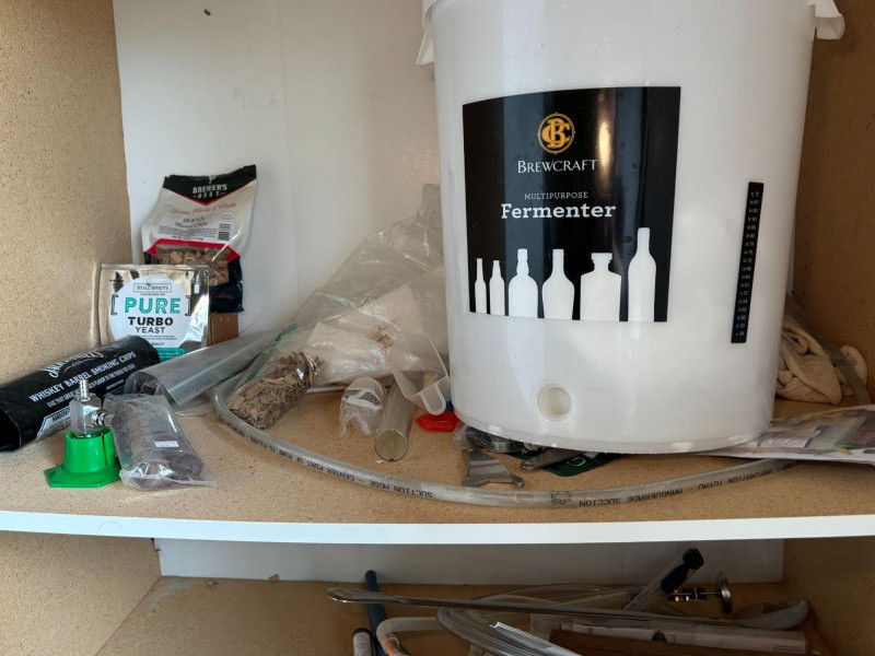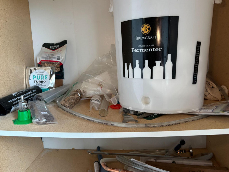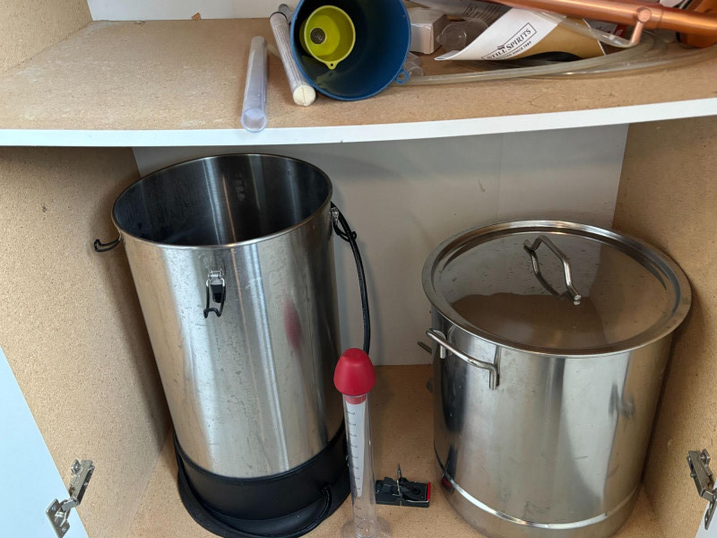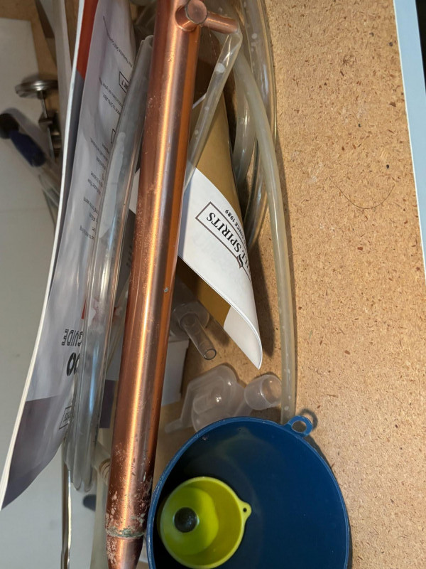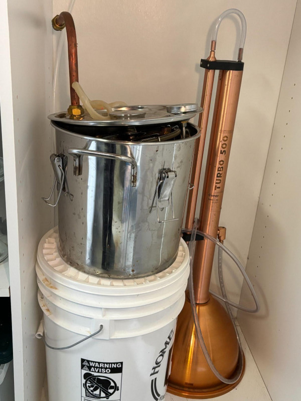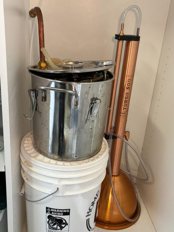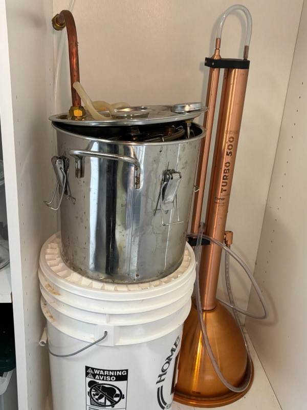 Complete home brewing and distilling setup, featuring a Turbo 500 still system along with stainless steel pots and fermentation equipment. This lot includes a copper Turbo 500 column, stainless steel vessels, and additional accessories for brewing or distilling. Ideal for hobbyists, home brewers, or anyone looking to get started or upgrade their setup. Great opportunity to acquire a full system at auction value. Includes all items shown in photos. Used condition. Equipment shows normal signs of use including water marks and residue typical of brewing/distilling equipment. Untested. Completeness unknown. Please review photos for full details. No