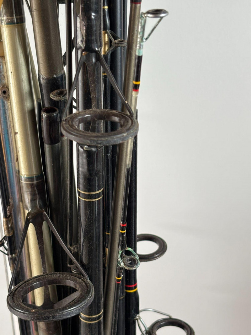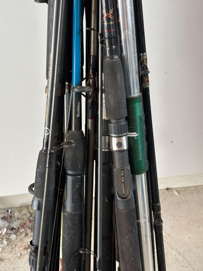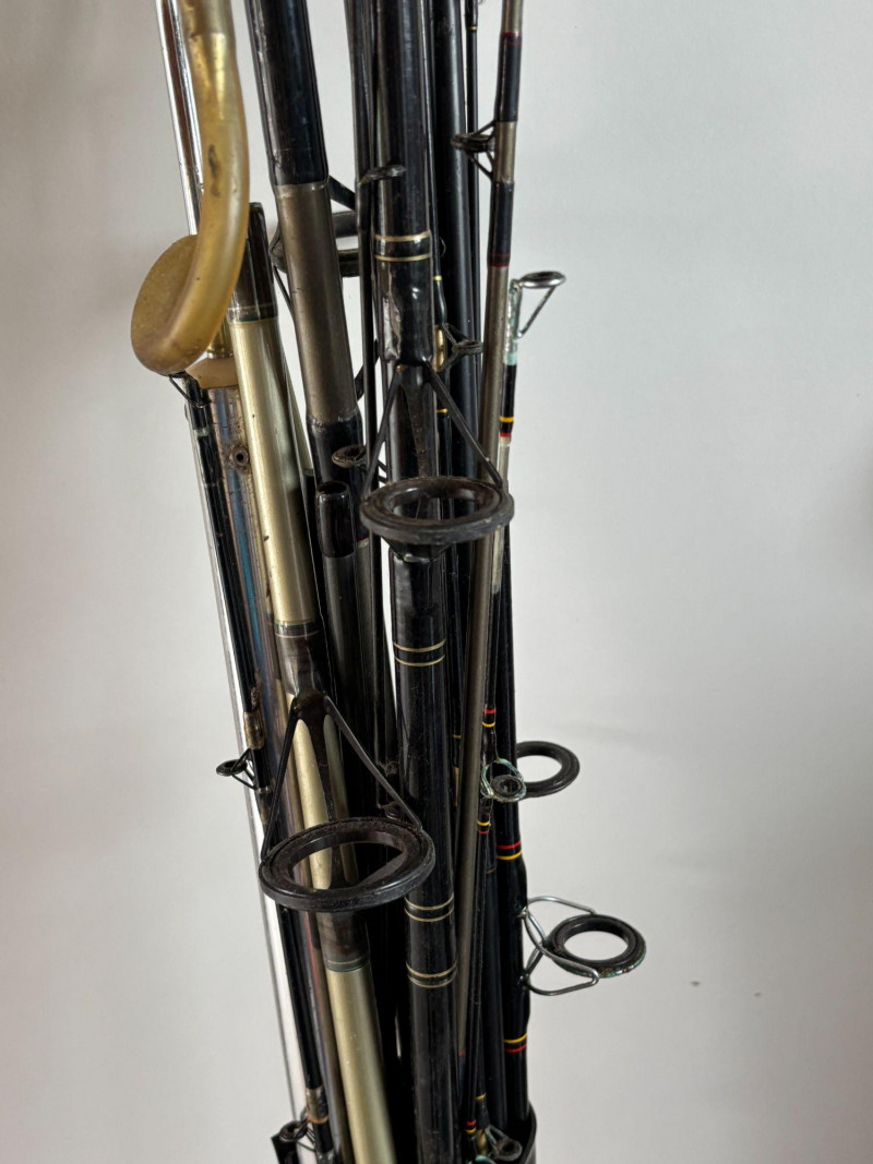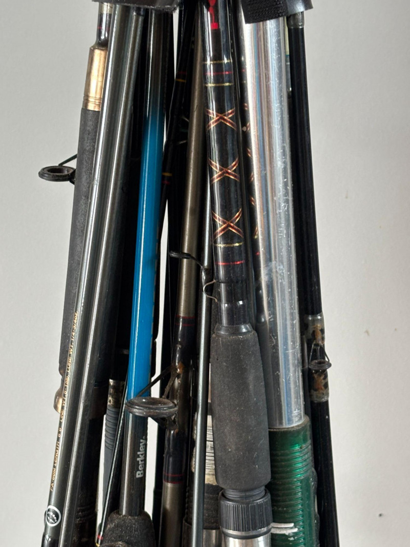 Mixed lot of fishing rods with storage holder, offering a variety of sizes and styles for both freshwater and saltwater use. Includes multiple rods as shown, along with a vertical rod holder for easy storage and transport. Great for anglers looking to add to their setup, outfit a boat, or for resale. Nice opportunity to grab a bulk lot of rods at auction value. Includes all items shown in photos. Used condition. Rods show wear from use including scuffs, corrosion on guides, and general aging. Untested. Some rods may need repair or parts. Please review photos carefully for details. No
