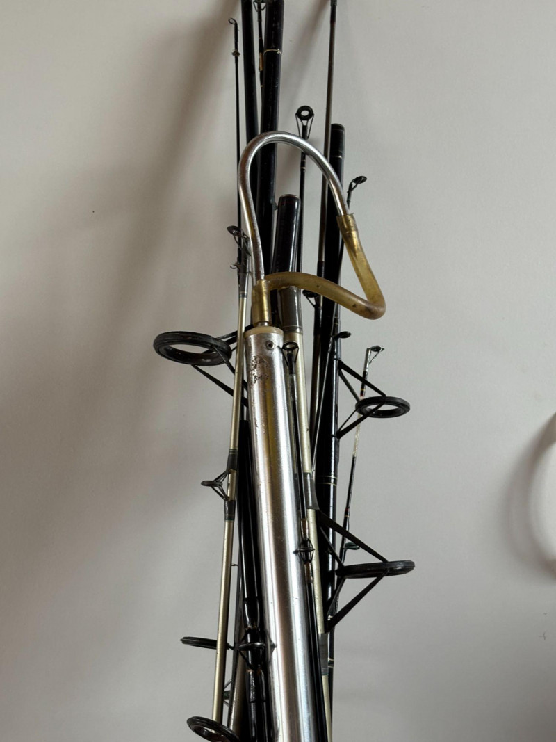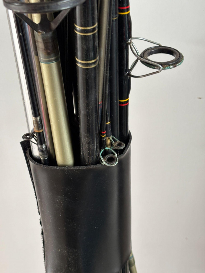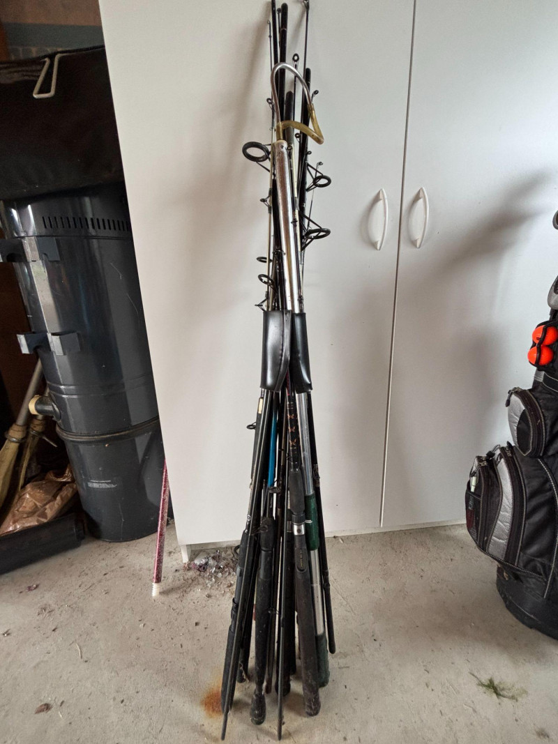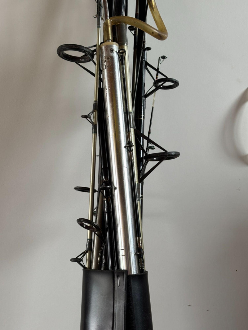 Mixed lot of fishing rods with storage holder, offering a variety of sizes and styles for both freshwater and saltwater use. Includes multiple rods as shown, along with a vertical rod holder for easy storage and transport. Great for anglers looking to add to their setup, outfit a boat, or for resale. Nice opportunity to grab a bulk lot of rods at auction value. Includes all items shown in photos. Used condition. Rods show wear from use including scuffs, corrosion on guides, and general aging. Untested. Some rods may need repair or parts. Please review photos carefully for details. No