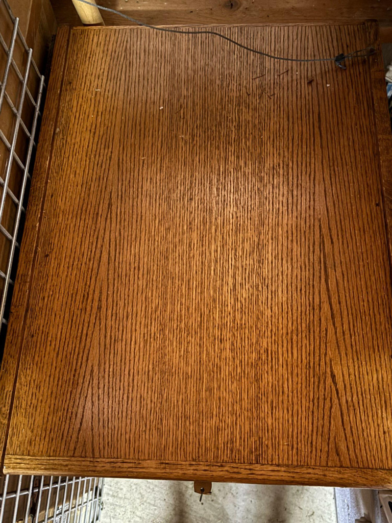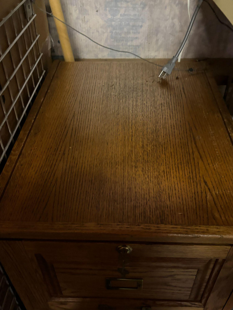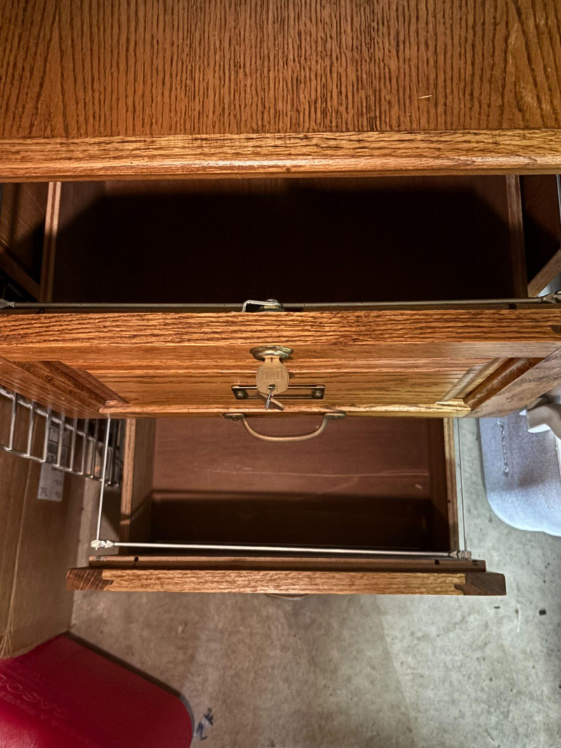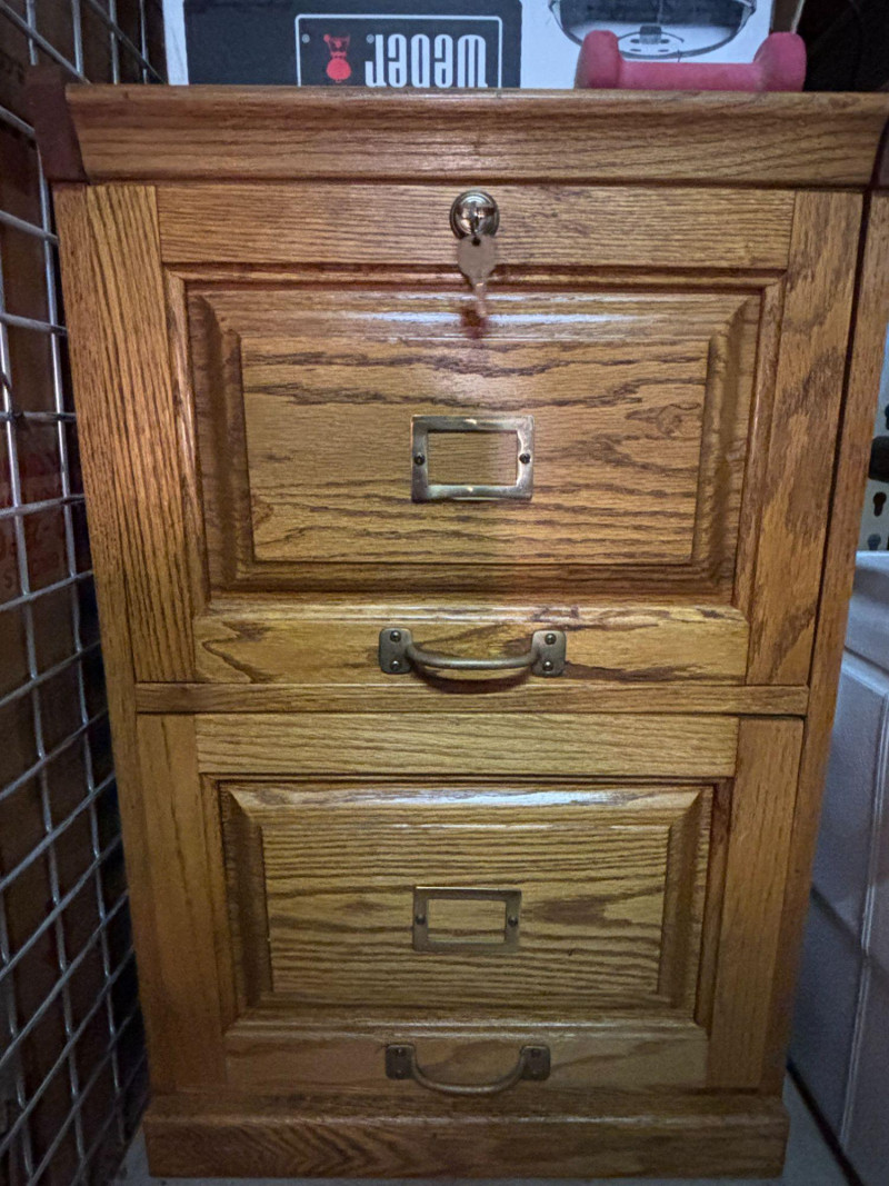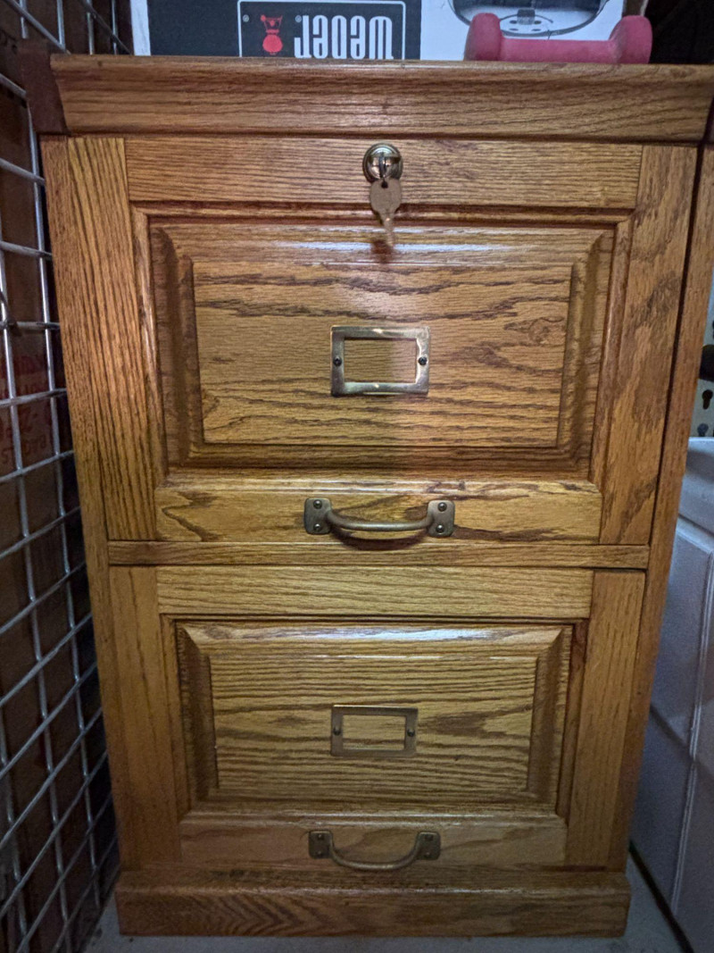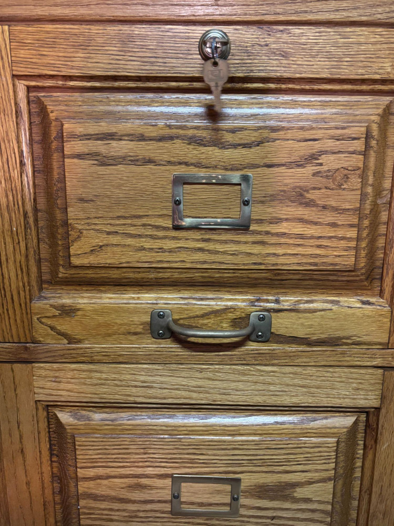 Solid wood 2-drawer file cabinet with classic oak finish and vintage-style hardware. Features two spacious drawers for document storage along with label holders on each drawer front. Includes working key for secure storage. Great for home office, workspace, or adding a warm, traditional touch to your setup. Includes cabinet and key as shown. Used condition. Shows normal wear consistent with use including minor surface marks. Drawers open and close. Key included. Please review photos for details. No